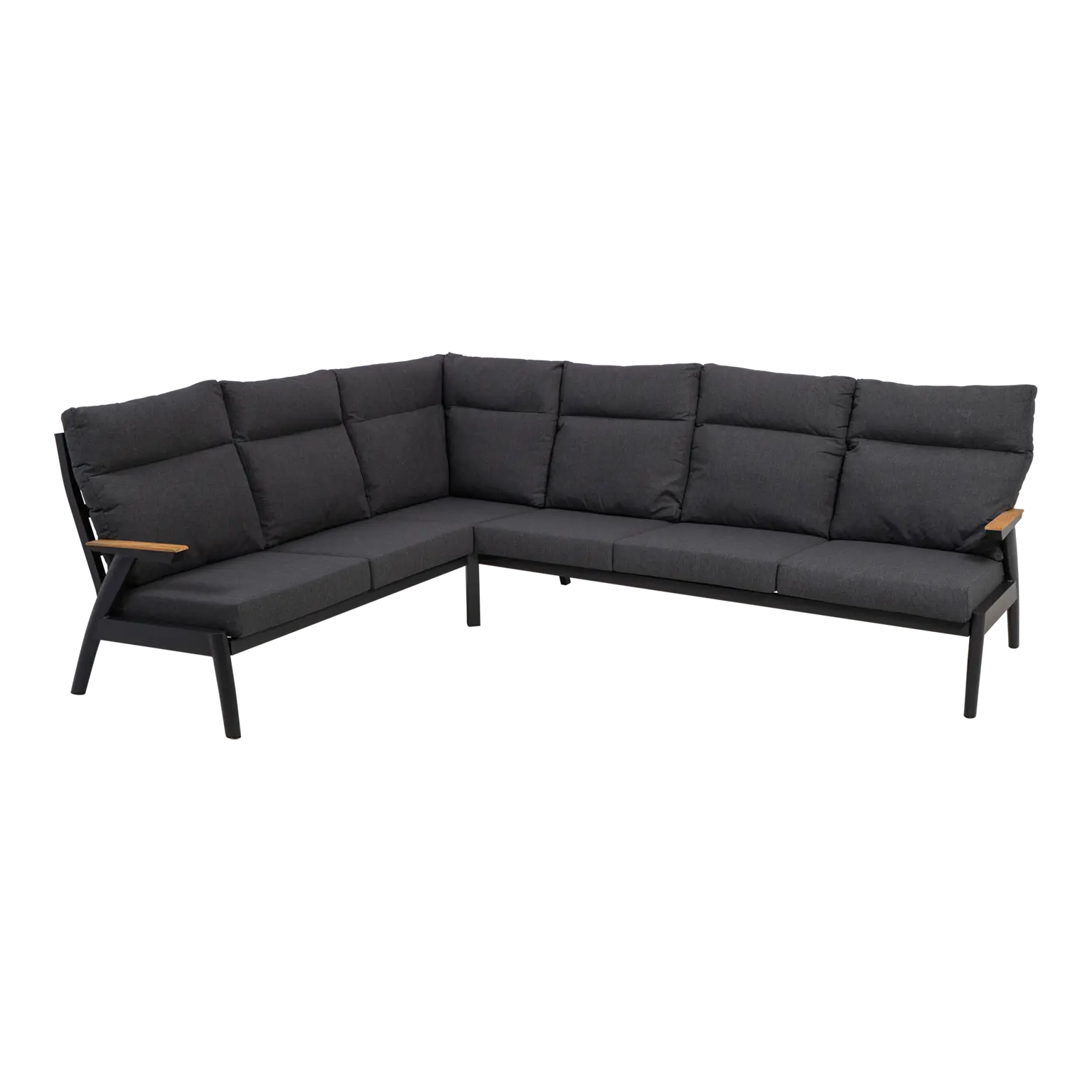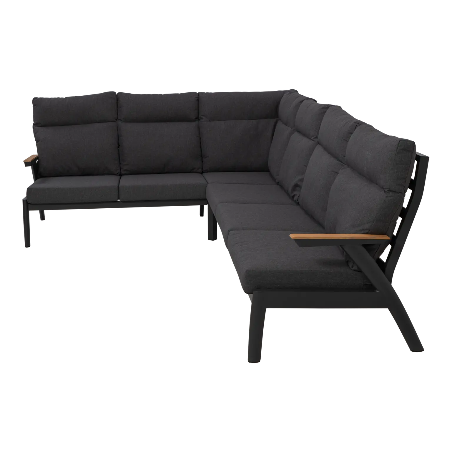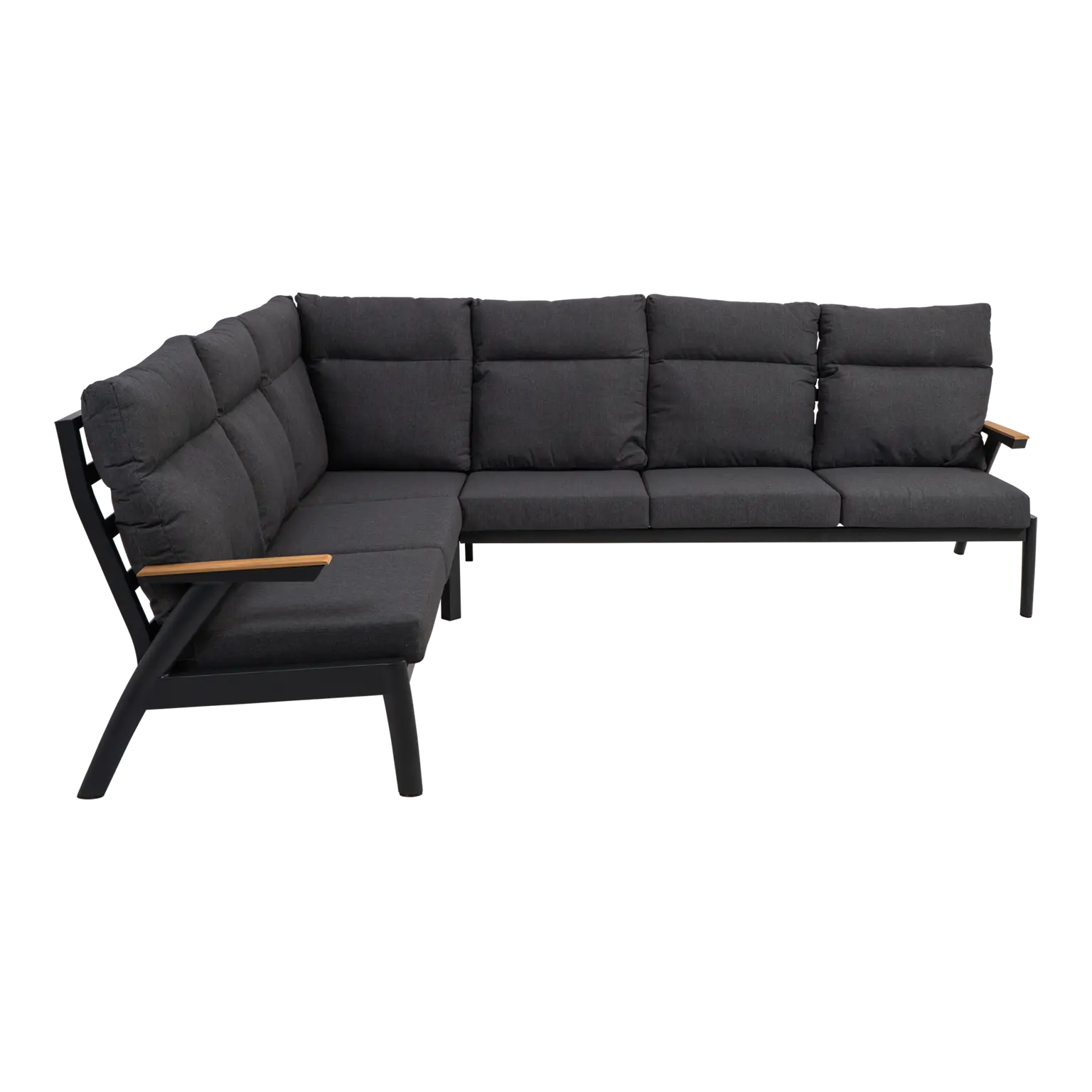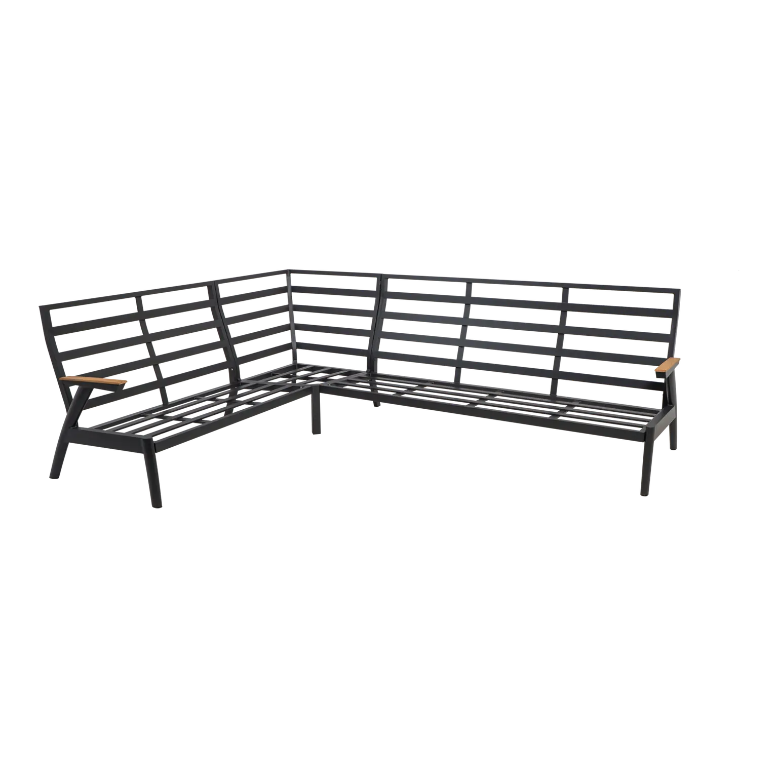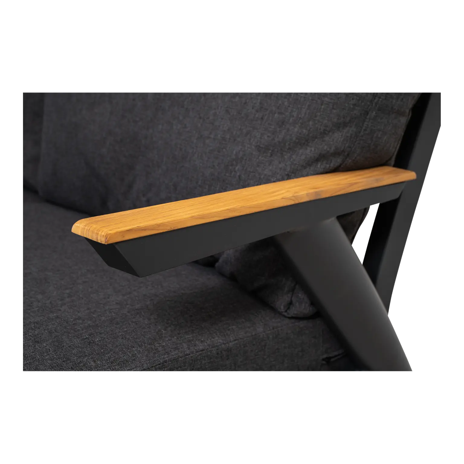 3-zitsbank met één armleuning 200x85x94cm | 2-zitsbank met één armleuning 135x85x94cm | Hoekbank 85x85x94cm | Aluminium frame mat antraciet | Teak armleuning | 220gr/m² olefin kussen