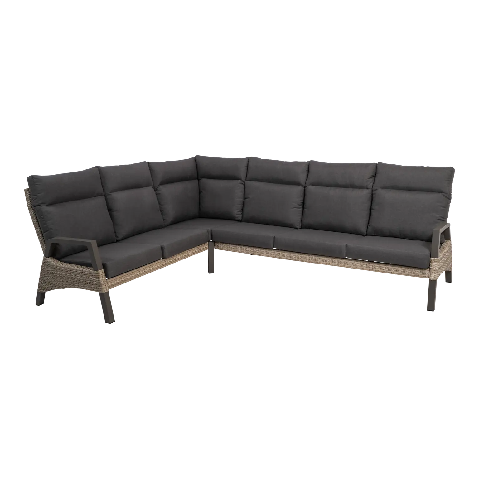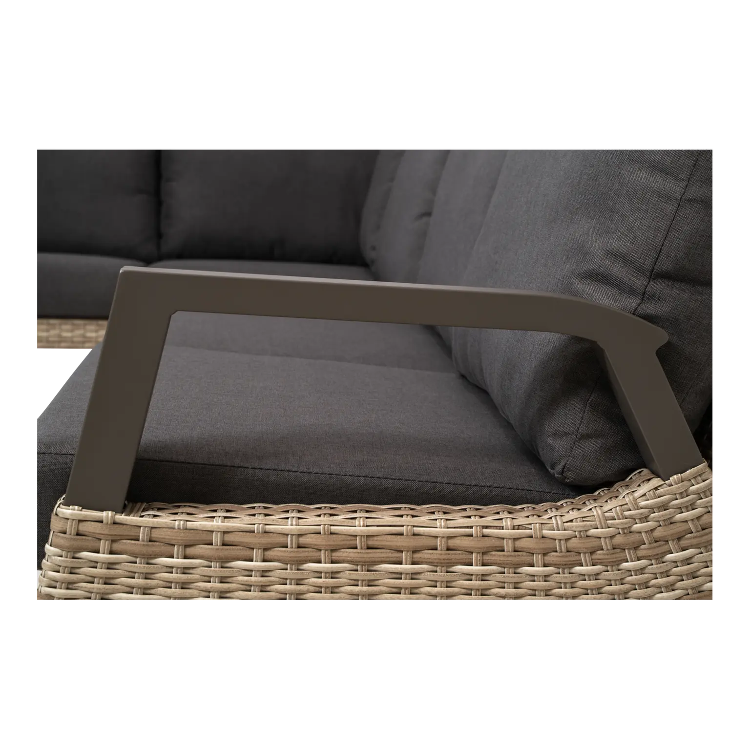 3-zits bank met één armleuning 200x86x94cm | 2-zits bank met één armleuning 135x86x94cm | Hoekbank 85x85x94cm | Aluminium frame pardo | 190gr/m² olefin kussen | Mix maat vlechtwerk taupe