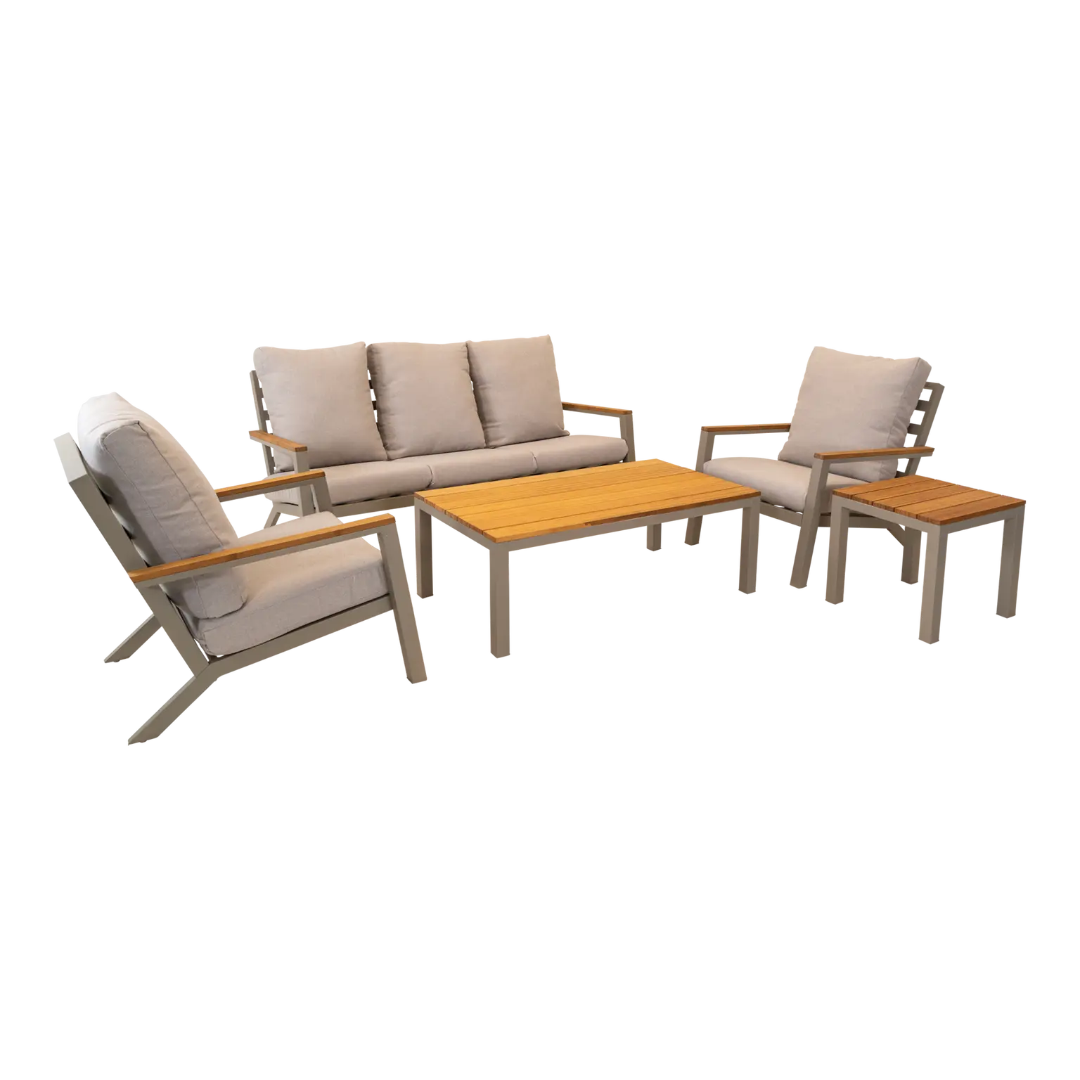 Stoel 75,5x99x79cm | Bank 175x99x79cm | Tafel 120x70x43cm | Bijzettafel 50x50x46cm | Aluminium frame mat taupe | 240gr/m² olefin kussen | Bovenkant: bamboe