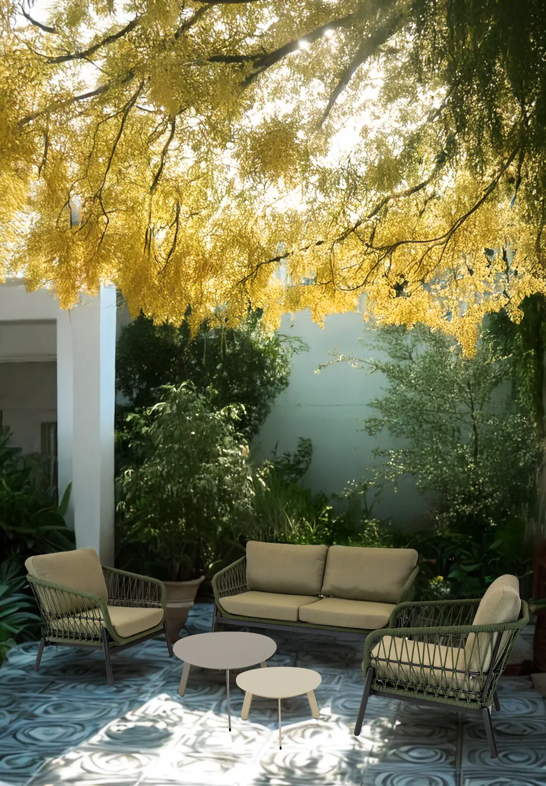 Stoel 77,5x83x72,5cm | Bank 163,5x83x72,5cm | Aluminium frame mat zwart | Ø8mm touw kleur donkergroen | 277gr/m² olefin kussen